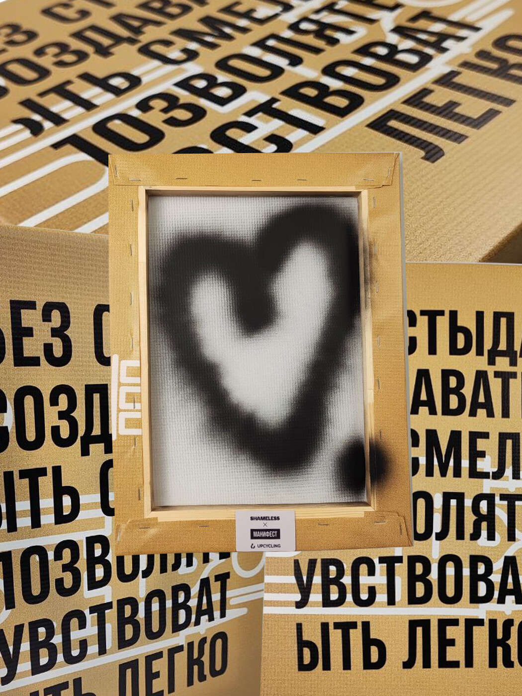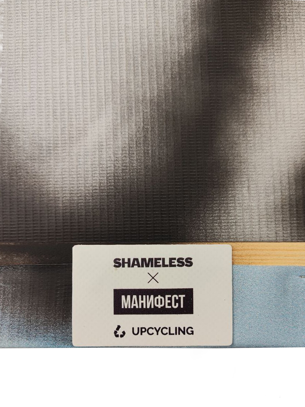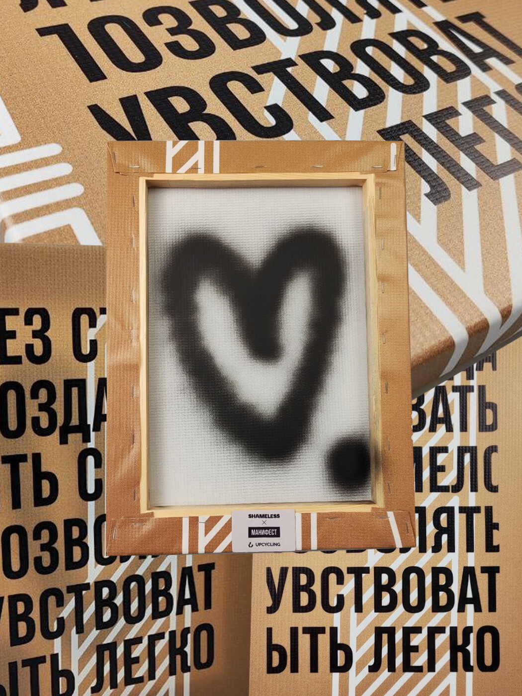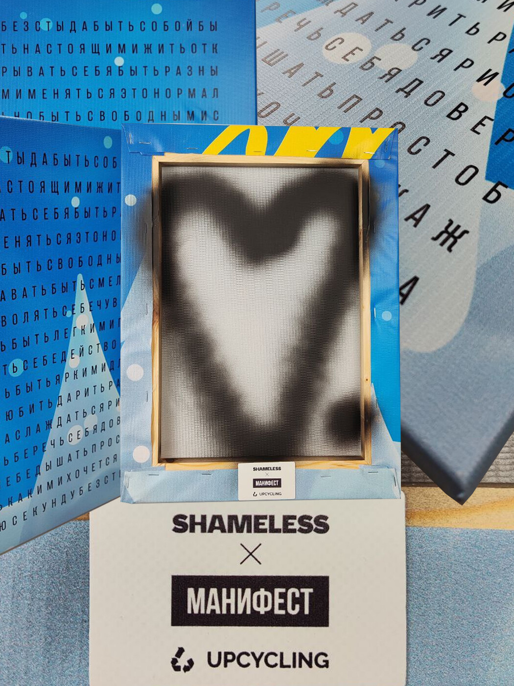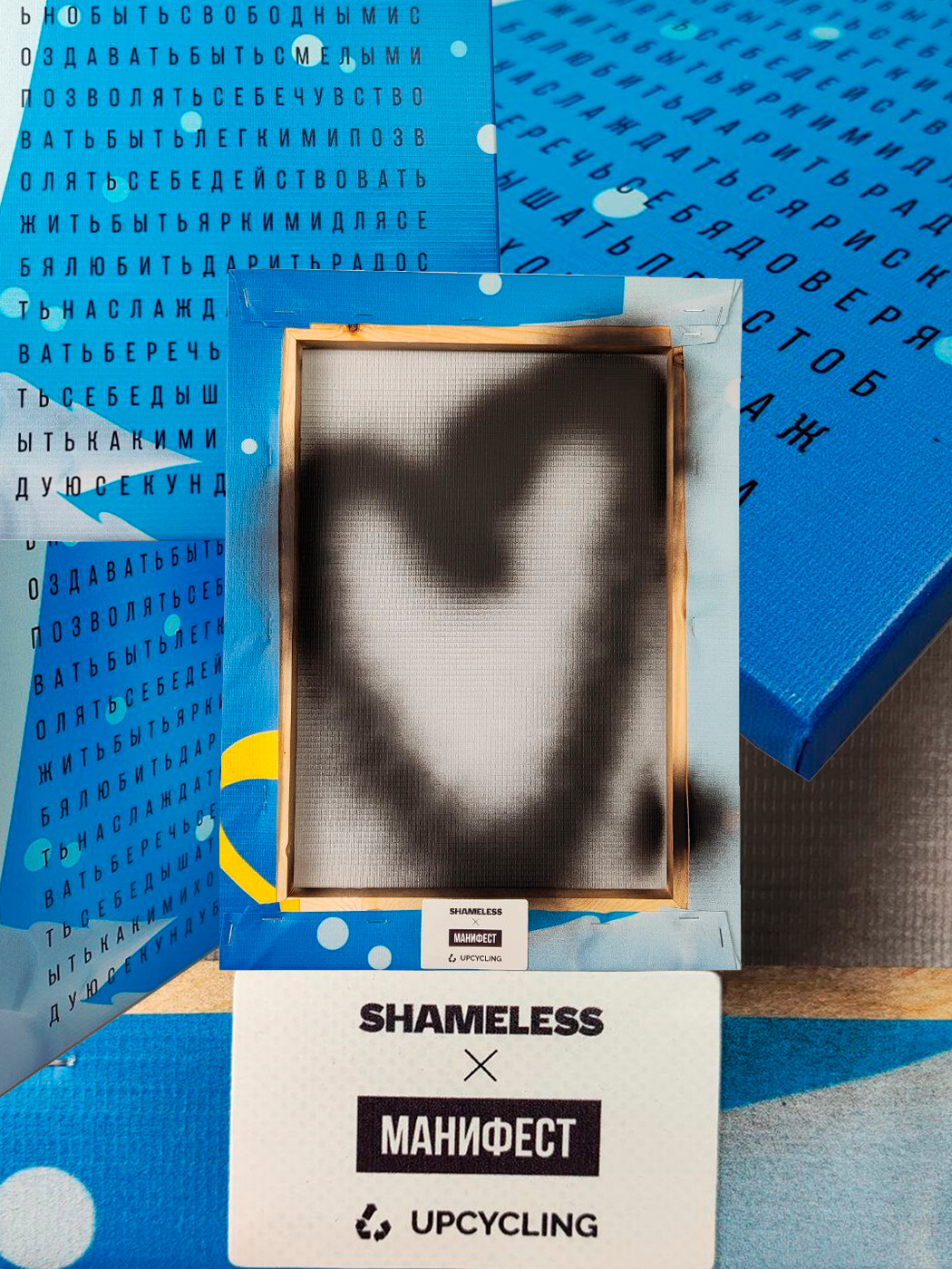 Текст на холсте — манифест бренда «SHAMELESS» как напоминание любить всем сердцем, показывать то, что глубоко внутри, уметь радоваться жизни даже в самые трудные моменты, верить, что в каждом из нас и так достаточно для счастья.