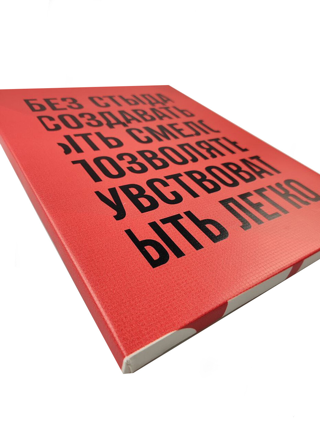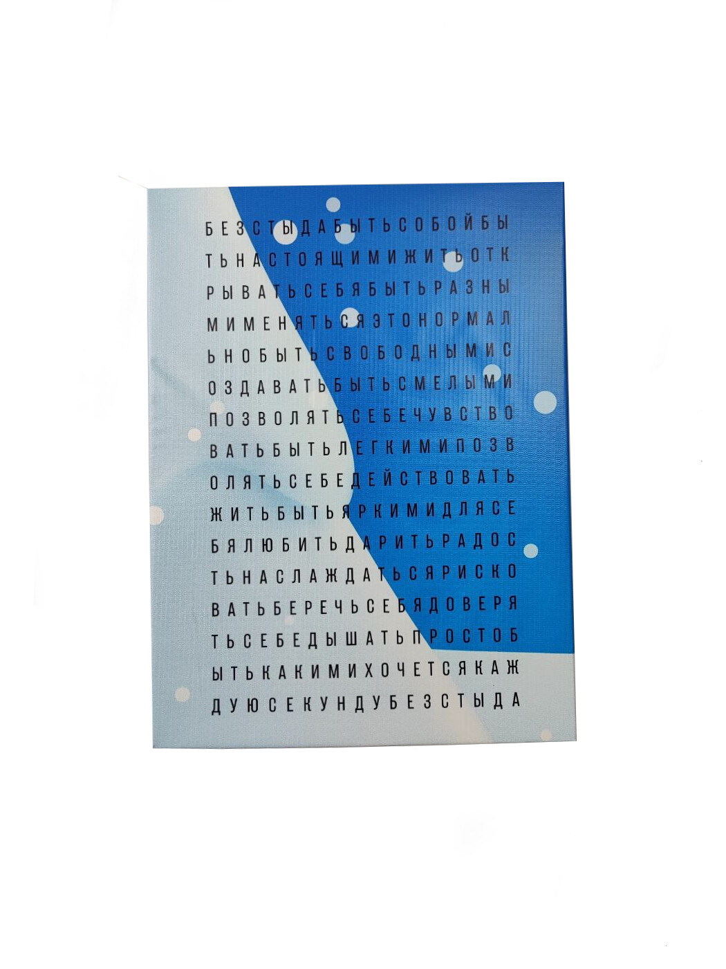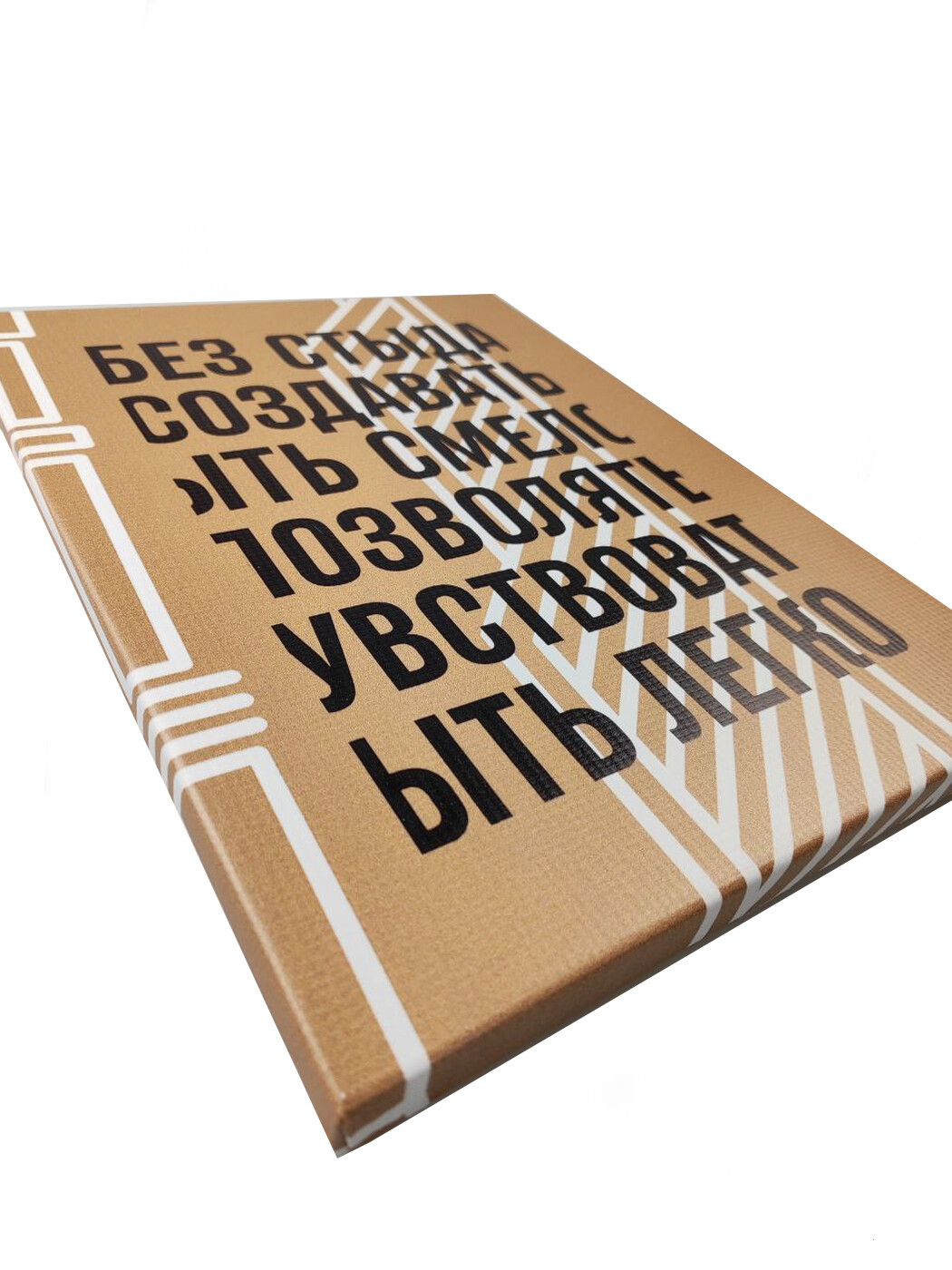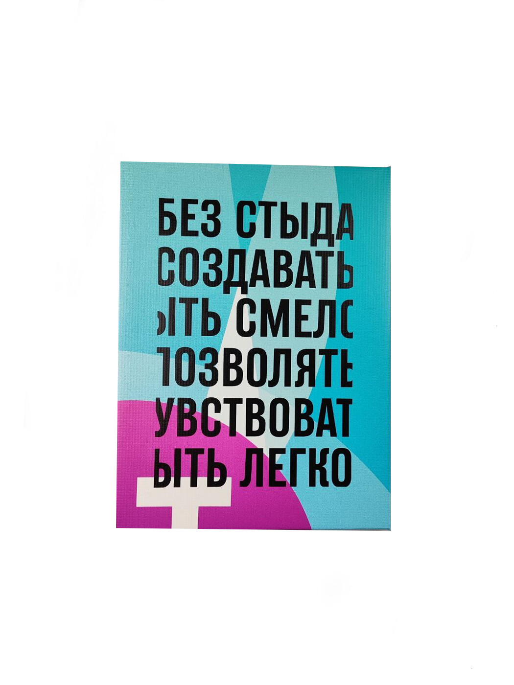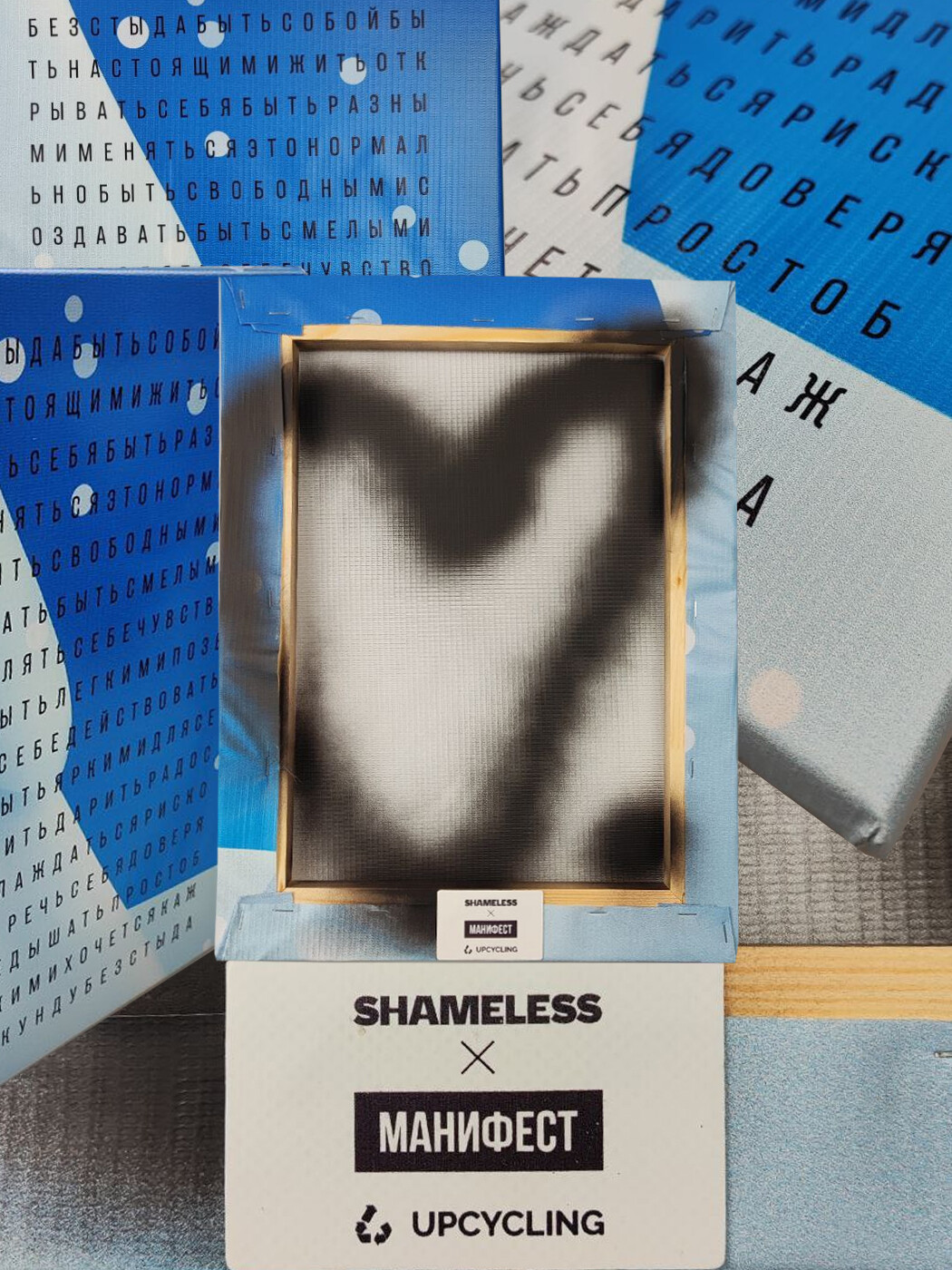 Текст на холсте — манифест бренда «SHAMELESS» как напоминание любить всем сердцем, показывать то, что глубоко внутри, уметь радоваться жизни даже в самые трудные моменты, верить, что в каждом из нас и так достаточно для счастья.