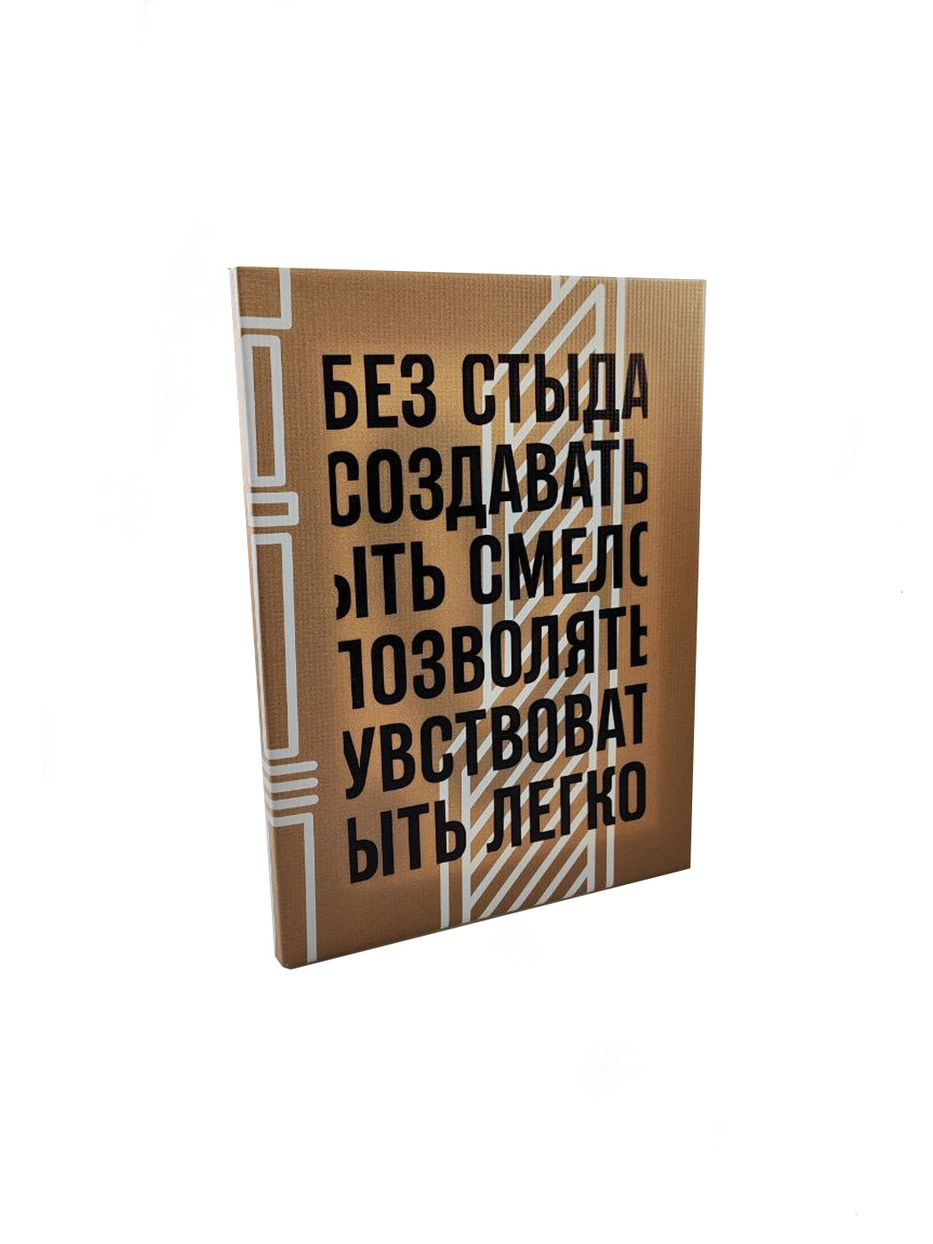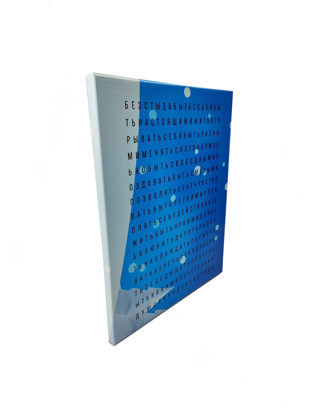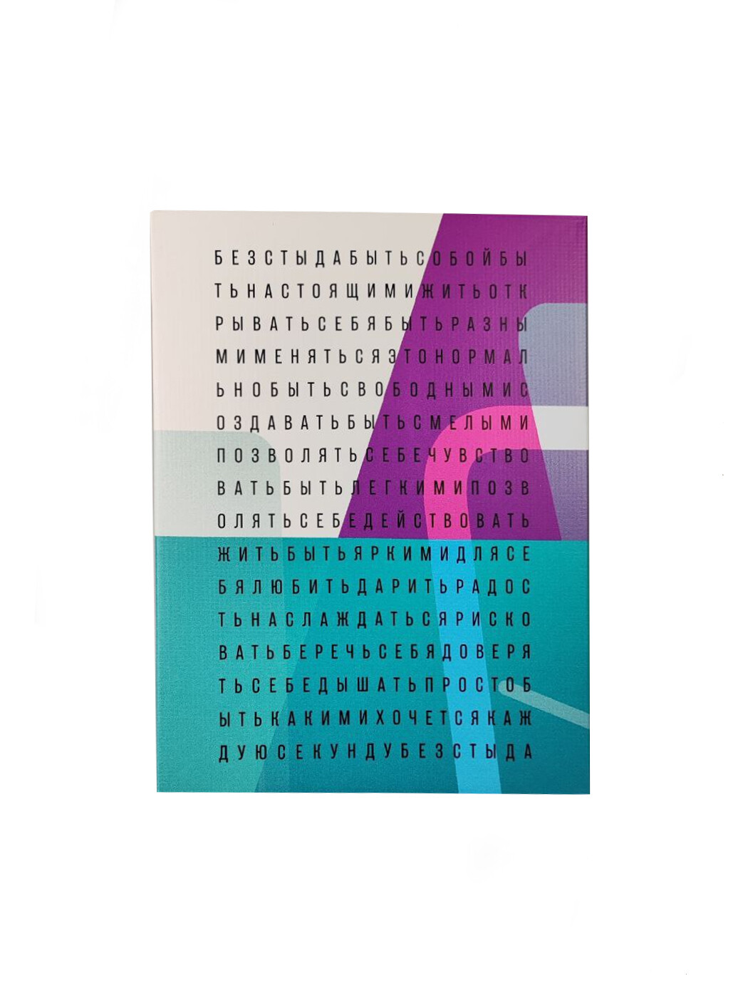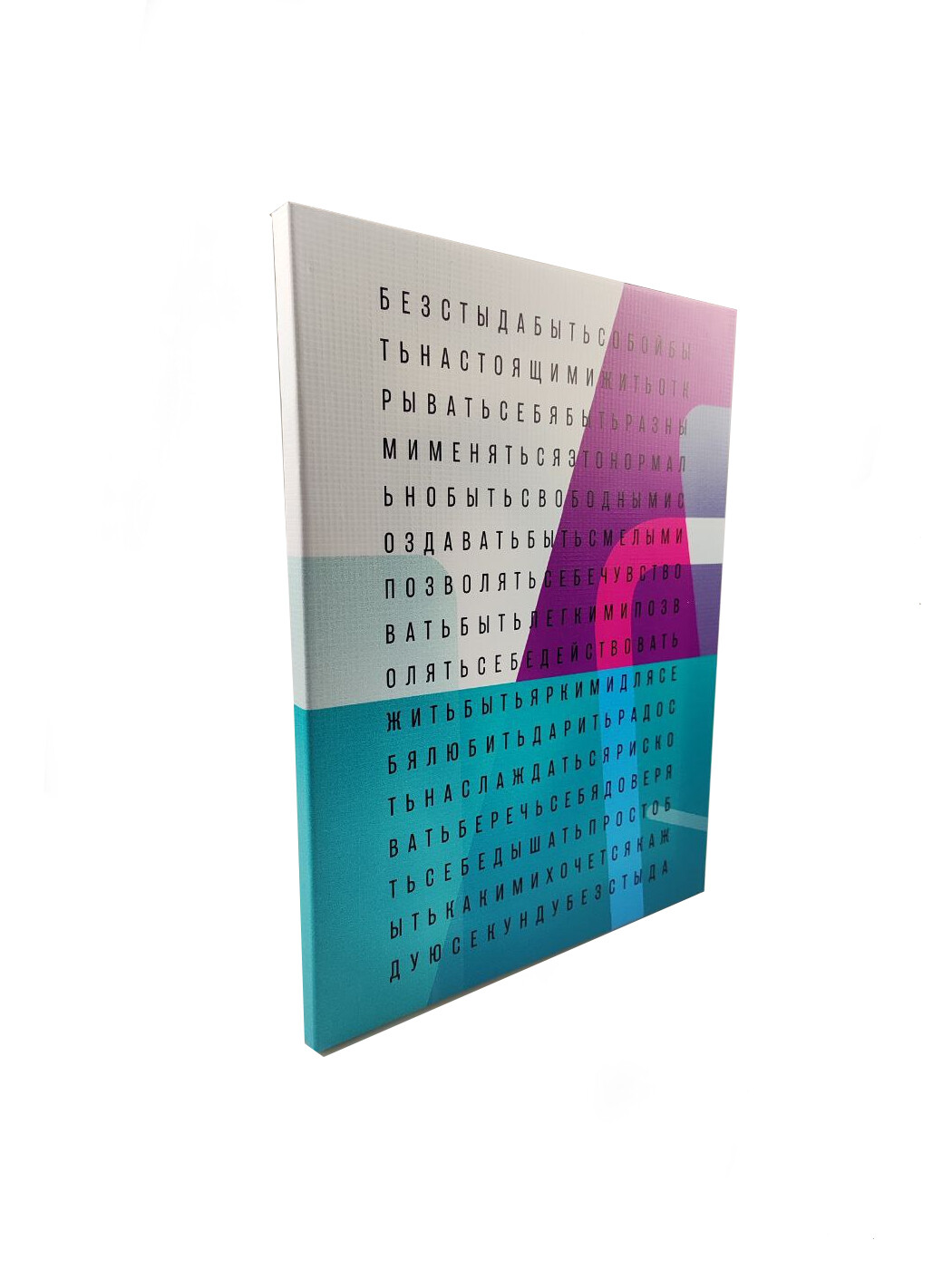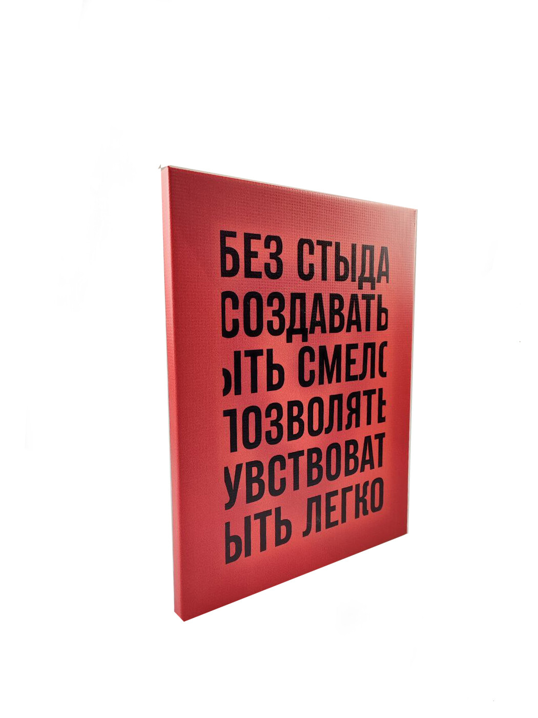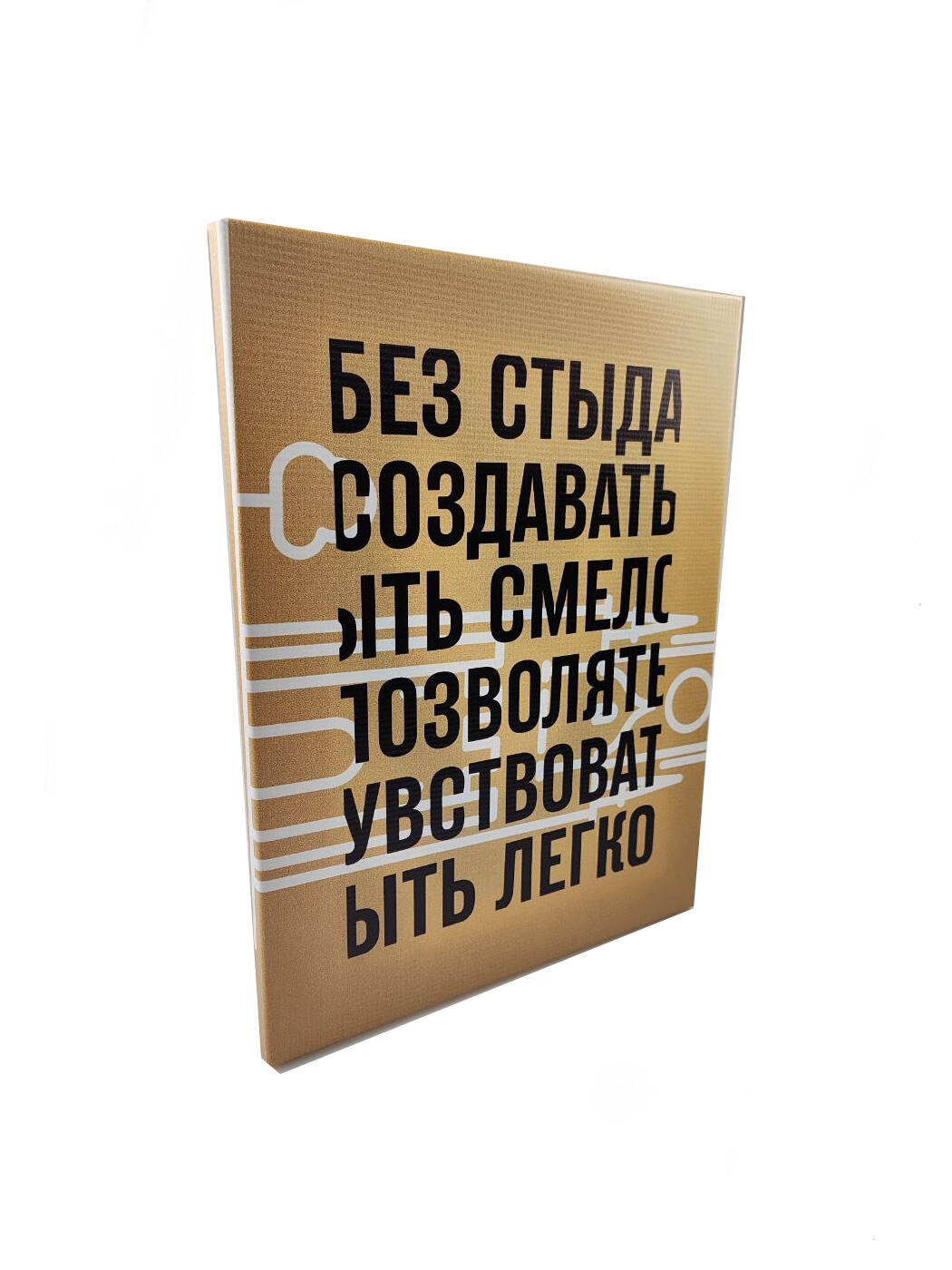 Текст на холсте — манифест бренда «SHAMELESS» как напоминание любить всем сердцем, показывать то, что глубоко внутри, уметь радоваться жизни даже в самые трудные моменты, верить, что в каждом из нас и так достаточно для счастья.
